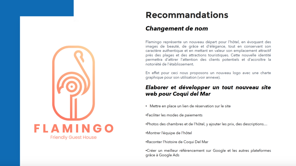 Je suis capable de élaborer une stratégie marketing dans un environnement instable (sanitaire, économique ou interne) car lors d’une étude, ma mission était de repenser tous les aspects du site d’un hôtel appelé Coqui Del Mar, en difficultés économiques, qui avaient des problèmes de réservations et un problème d’image. Pour cela, j’ai élaboré une stratégie marketing.