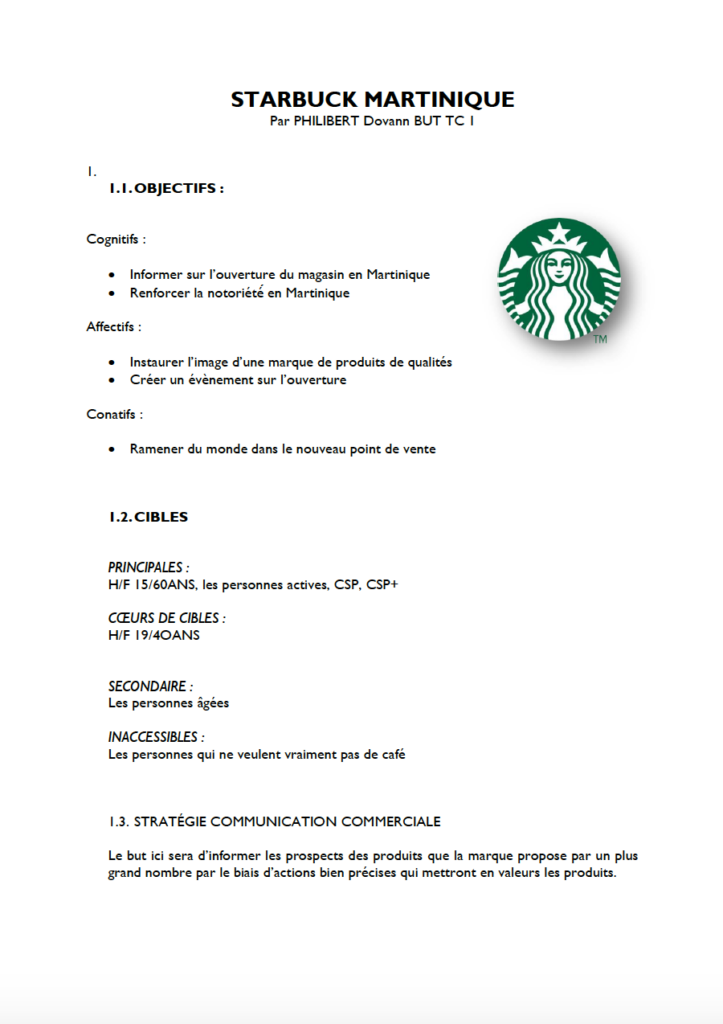 Je suis capable d‘identifier les cibles et objectifs de communication en tenant compte de la cohérence du mix car dans cette étude de cas sur l’entreprise Starbucks, l’objectif était d’ouvrir l’enseigne Starbucks en Martinique et pour cela je devais déterminer chaque objectif de communication ainsi que justifier comment je m’y prendrais pour l’atteindre