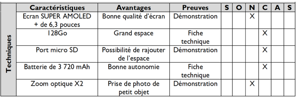 Je suis capable de concevoir des OAV efficaces car lors d’une étude de cas sur l’entreprise Samsung, le but était de préparer la vente d’un téléphone. J’ai utilisé la méthode SONCAS pour mettre en valeur les caractéristiques du produit.