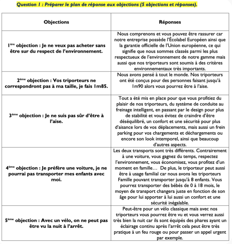Je suis capable de recourir aux codes d’expression spécifiques et professionnels car dans cette étude de cas, j’ai dû préparer un plan de réponse en cas d’objections du client concernant un produit : le triporteur