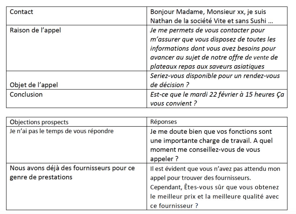 Je suis capable de concevoir un argumentaire de vente qui permette de proposer une solution adaptée aux besoins du client car avant un entretien de vente pour une marque de Sushi, j’ai dû préparer argumentaires de vente avec les différents les différentes étapes de la prise de contact avec le client.
